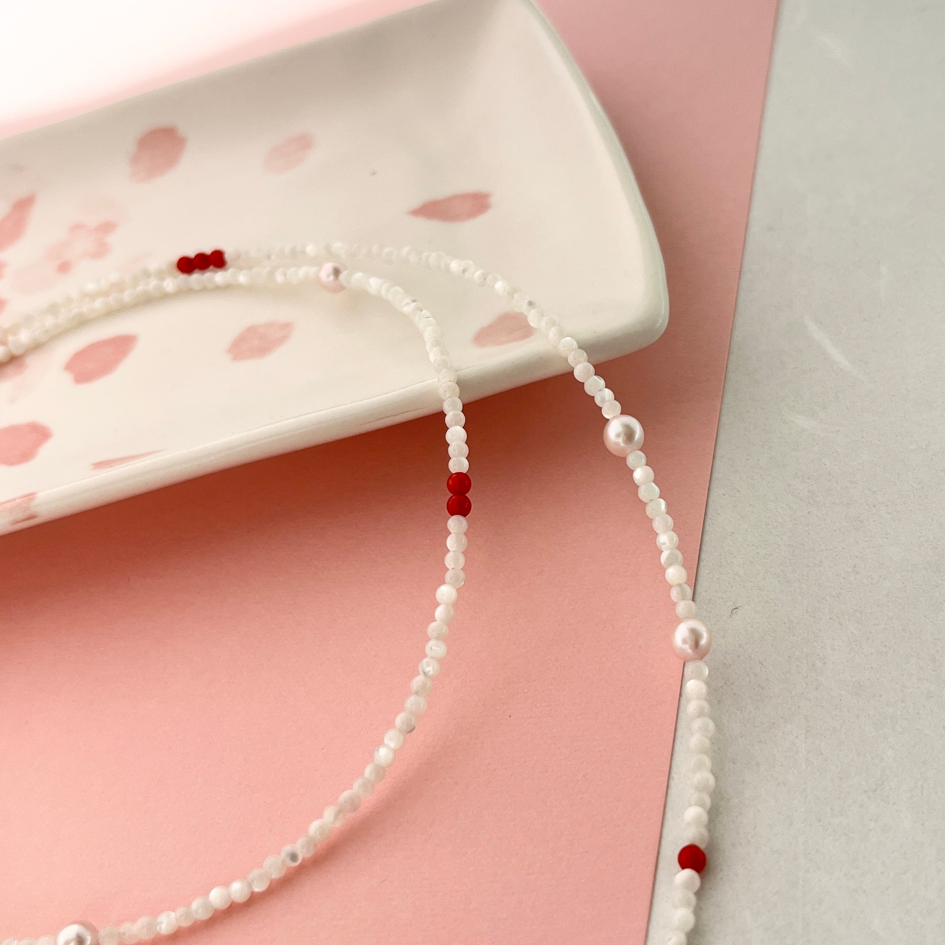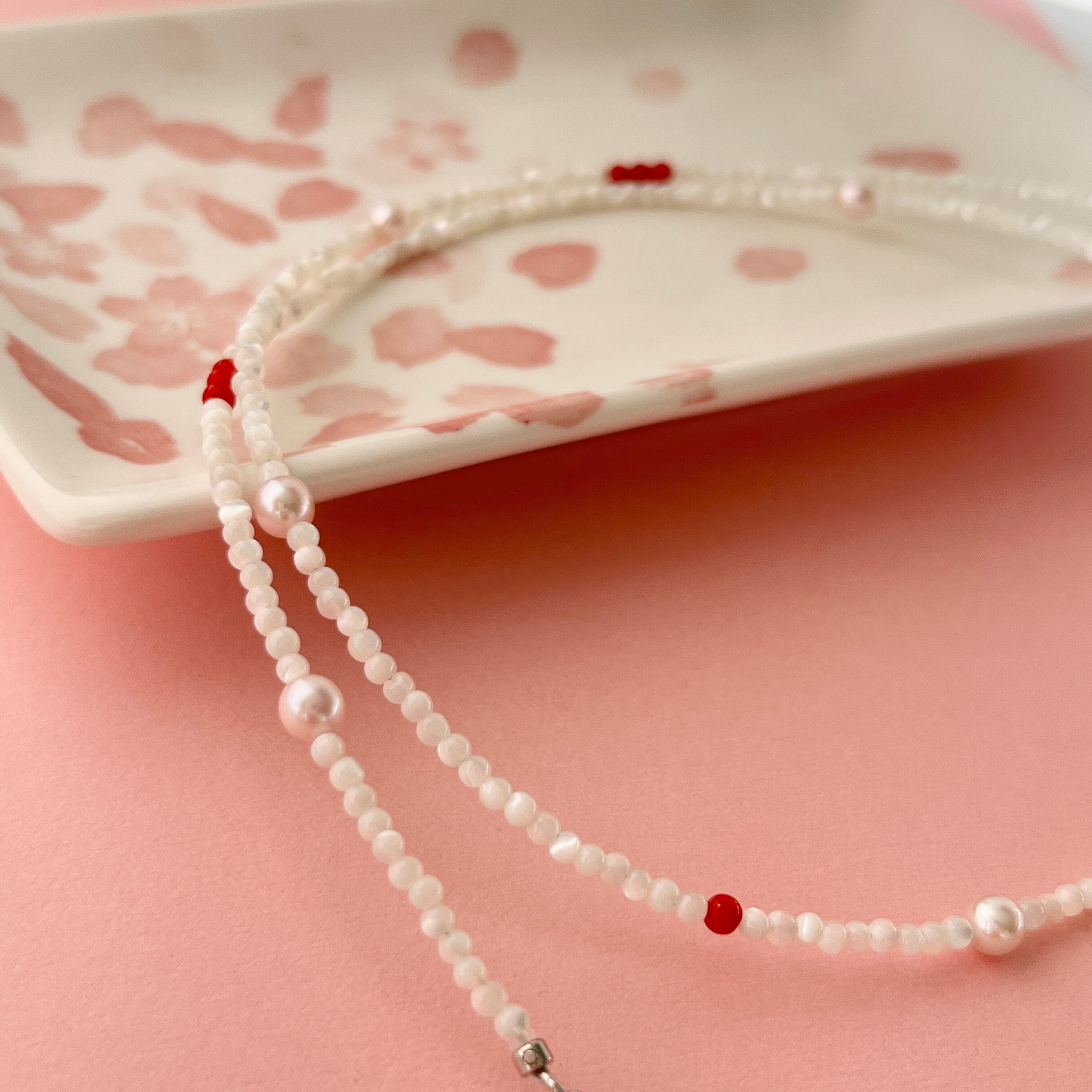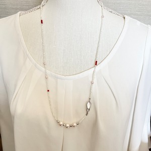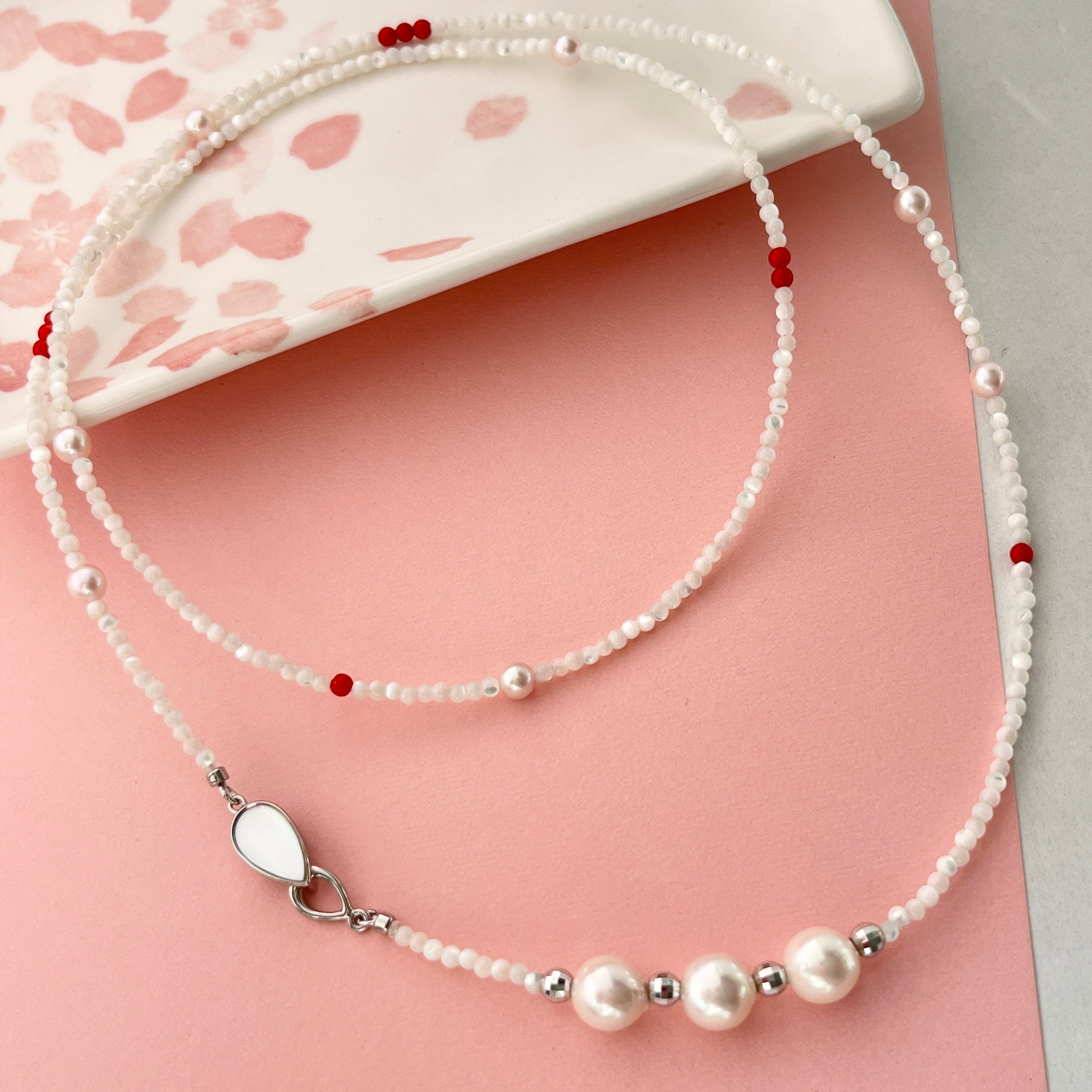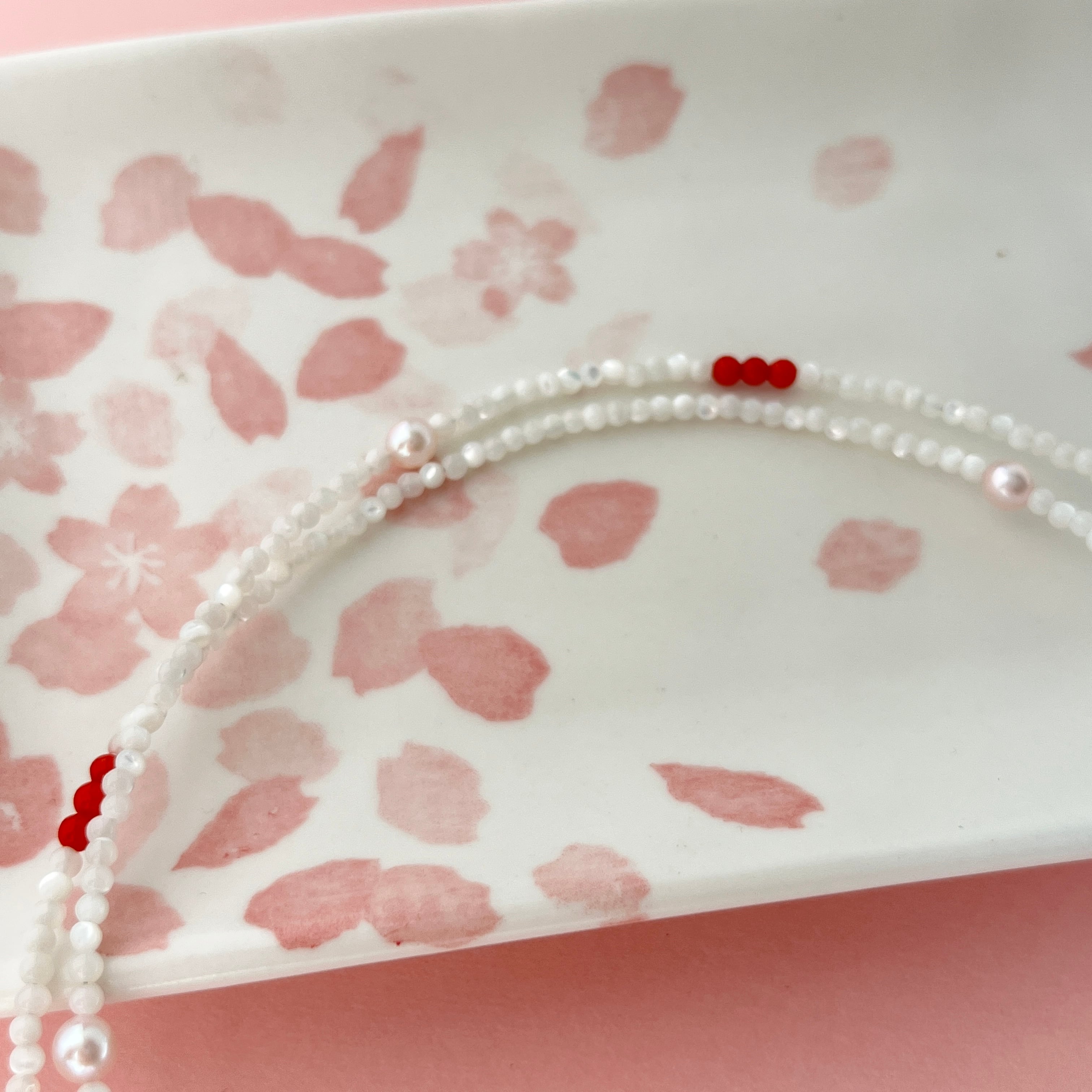 やさしい春色をまとった、上品で可憐なロングネックレス。あこや真珠のやわらかな艶めきに、白蝶貝のやさしい光沢、そしてアクセントとして散りばめられた珊瑚の赤が、シンプルながらも印象的な美しさを演出します。繊細なビーズとの組み合わせが軽やかで、長時間でも心地よく身に着けていただけます。