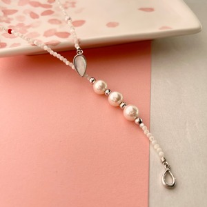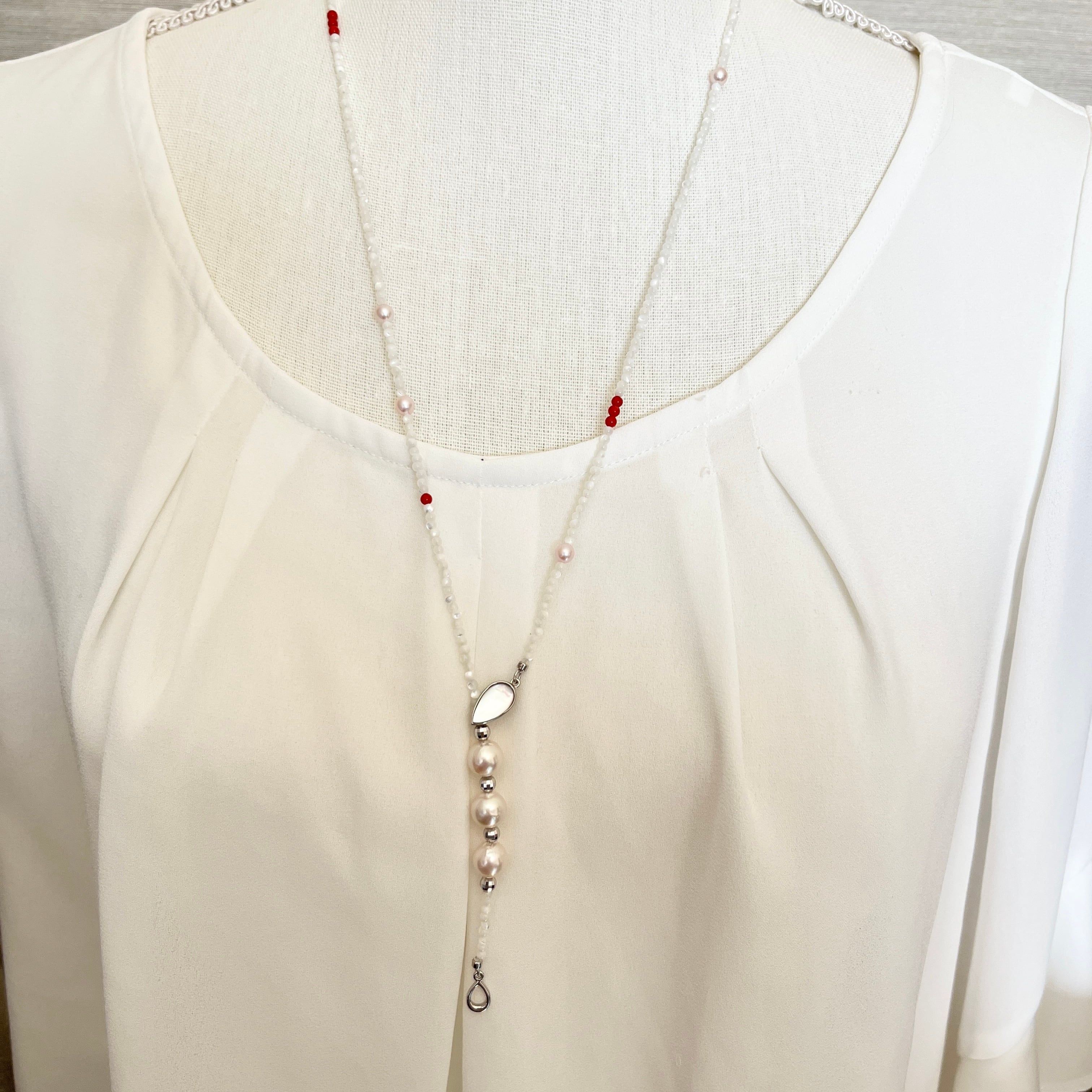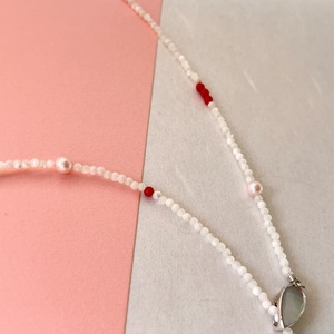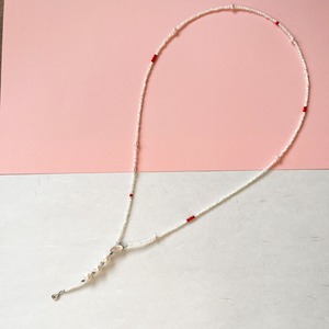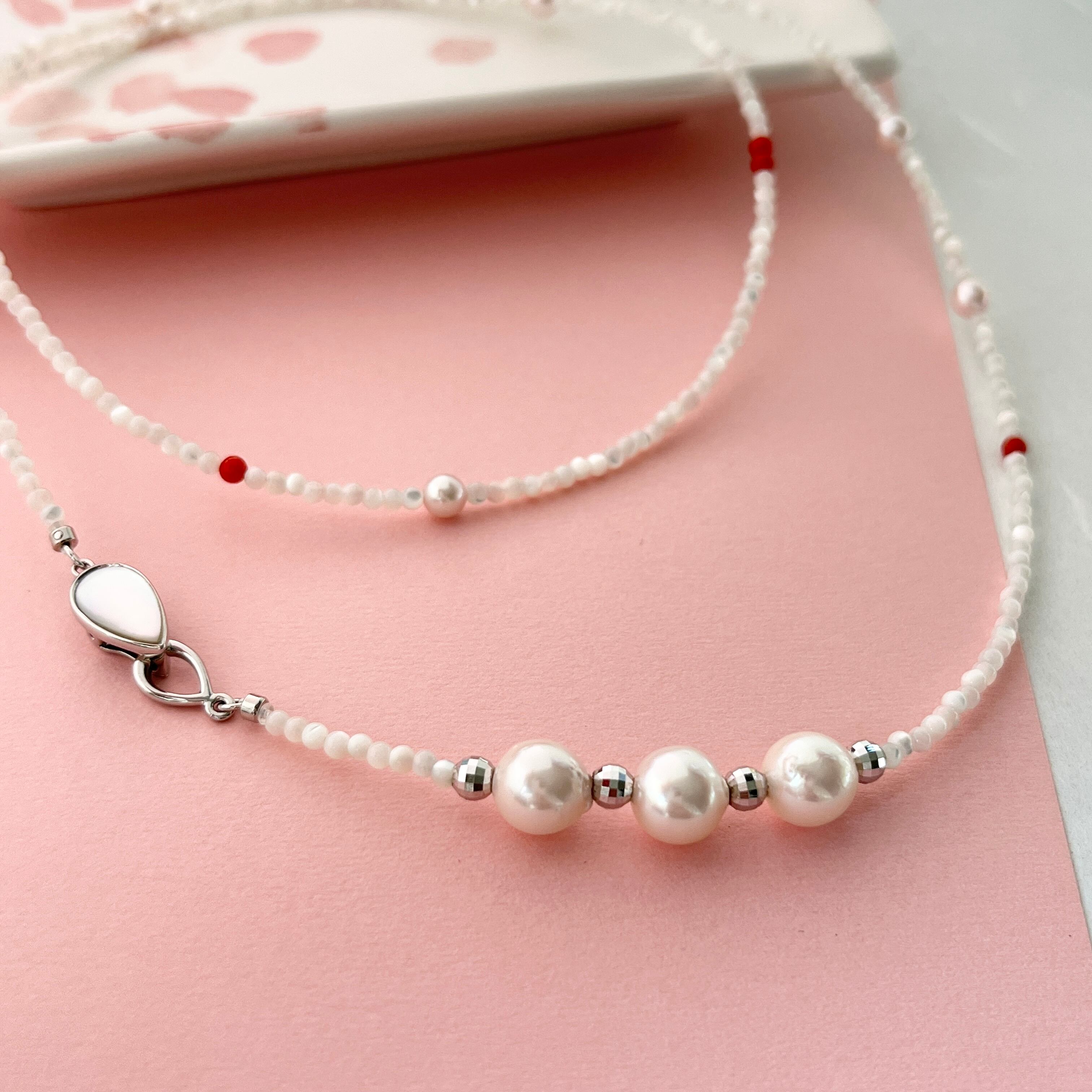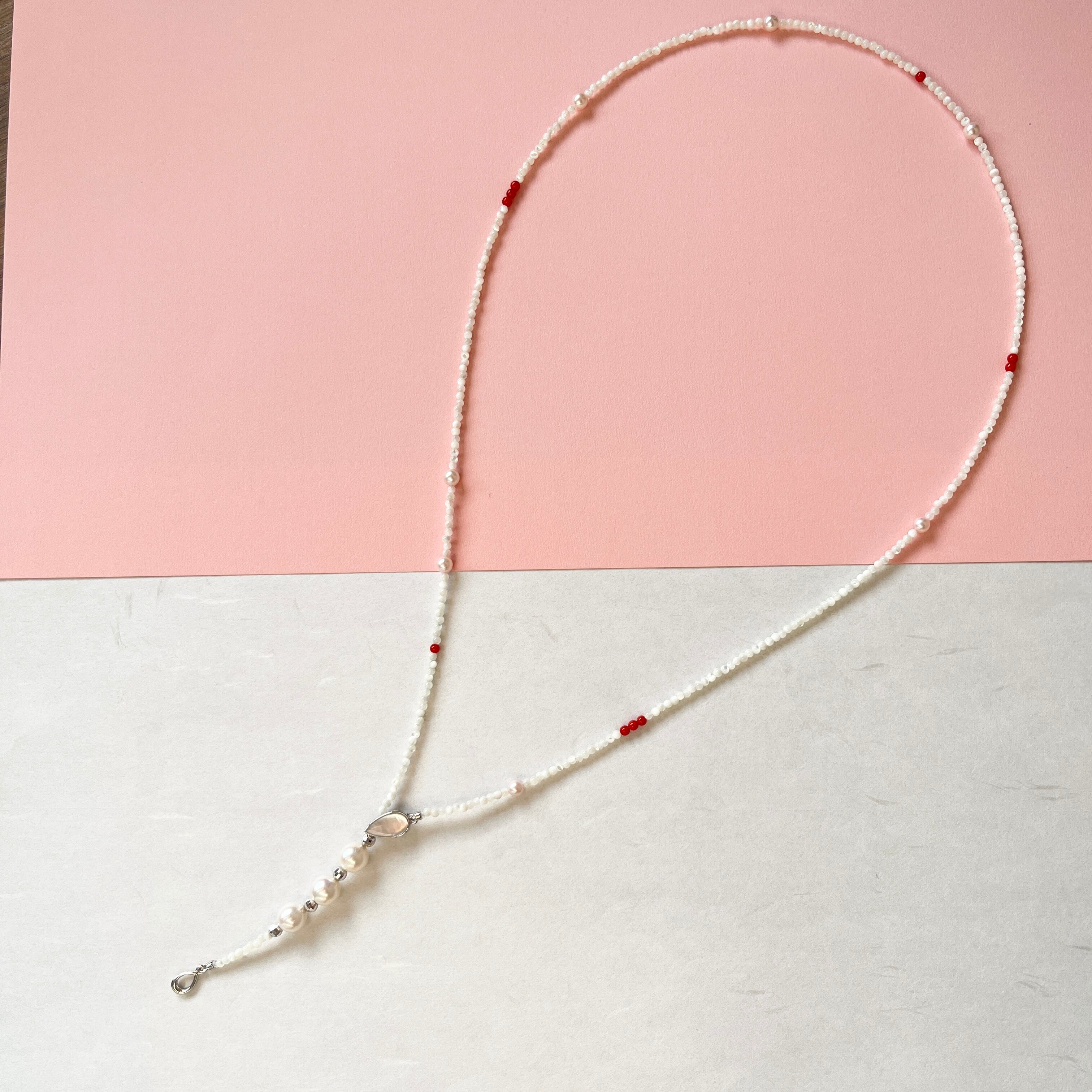 やさしい春色をまとった、上品で可憐なロングネックレス。あこや真珠のやわらかな艶めきに、白蝶貝のやさしい光沢、そしてアクセントとして散りばめられた珊瑚の赤が、シンプルながらも印象的な美しさを演出します。繊細なビーズとの組み合わせが軽やかで、長時間でも心地よく身に着けていただけます。