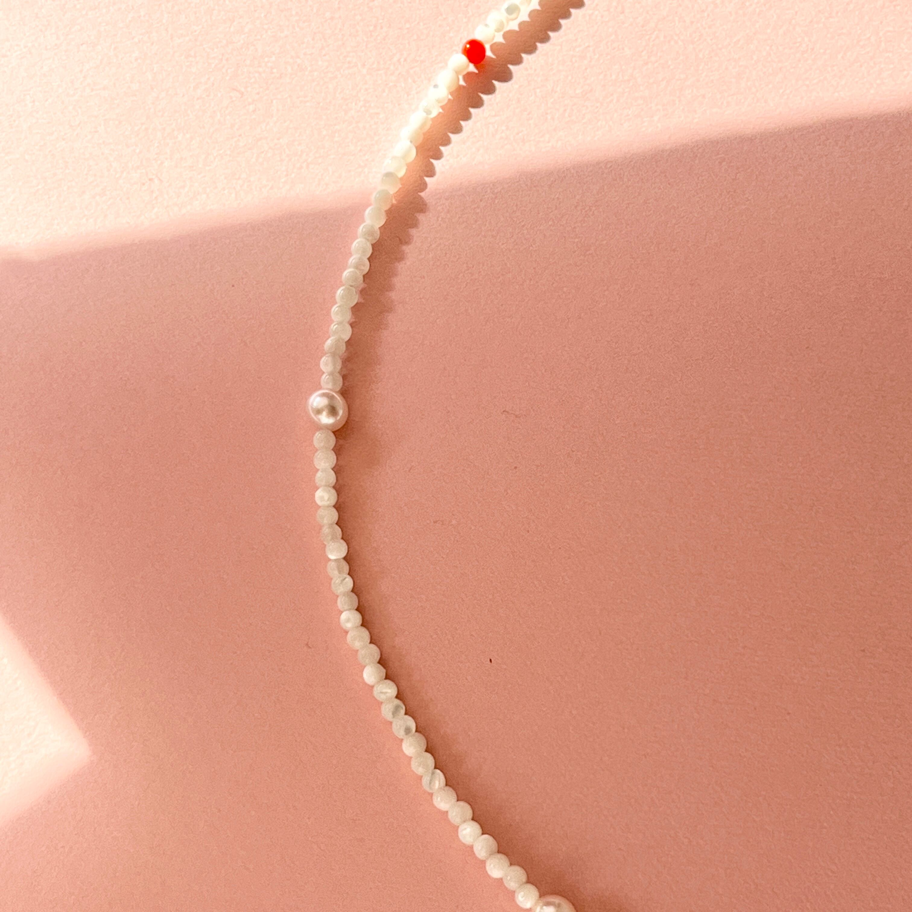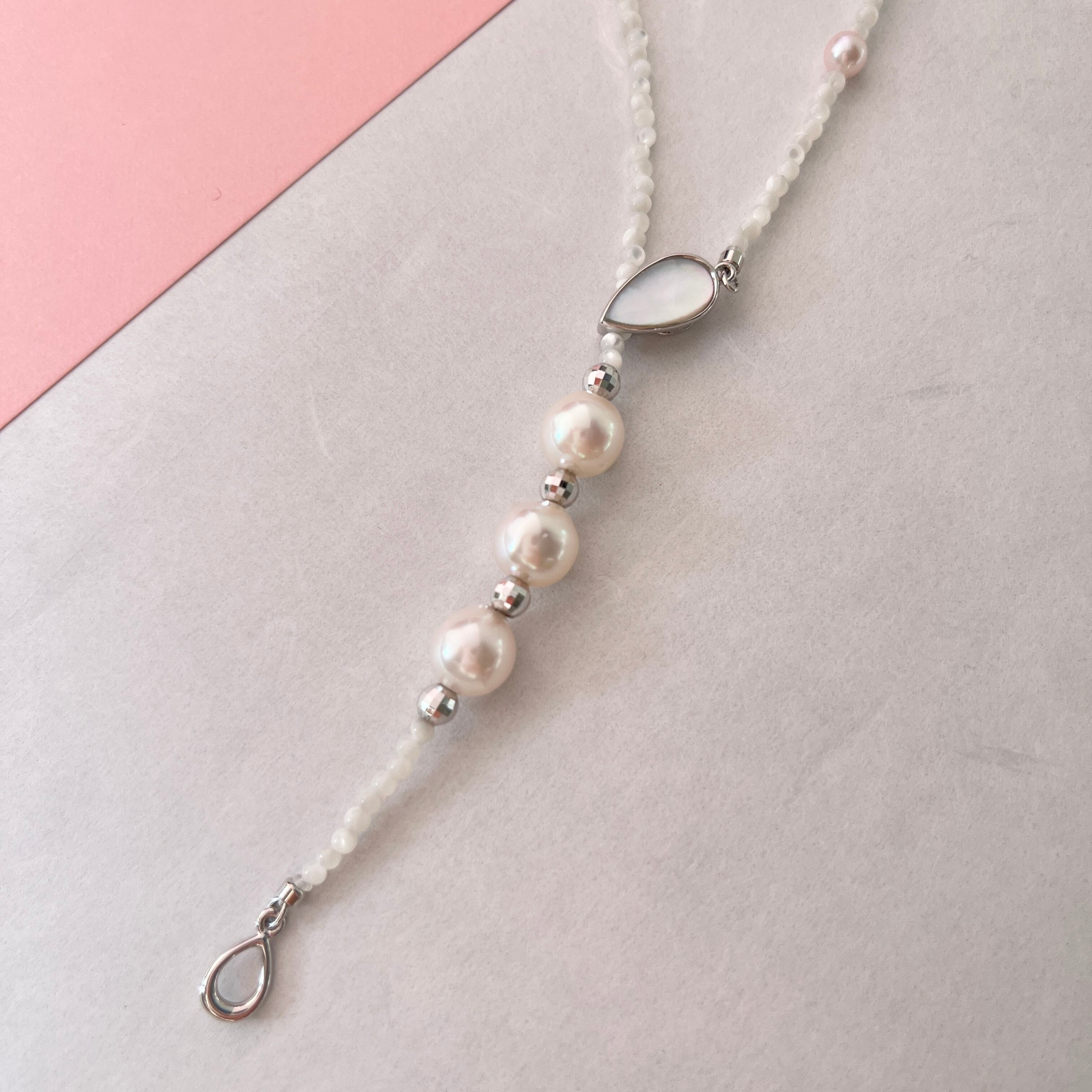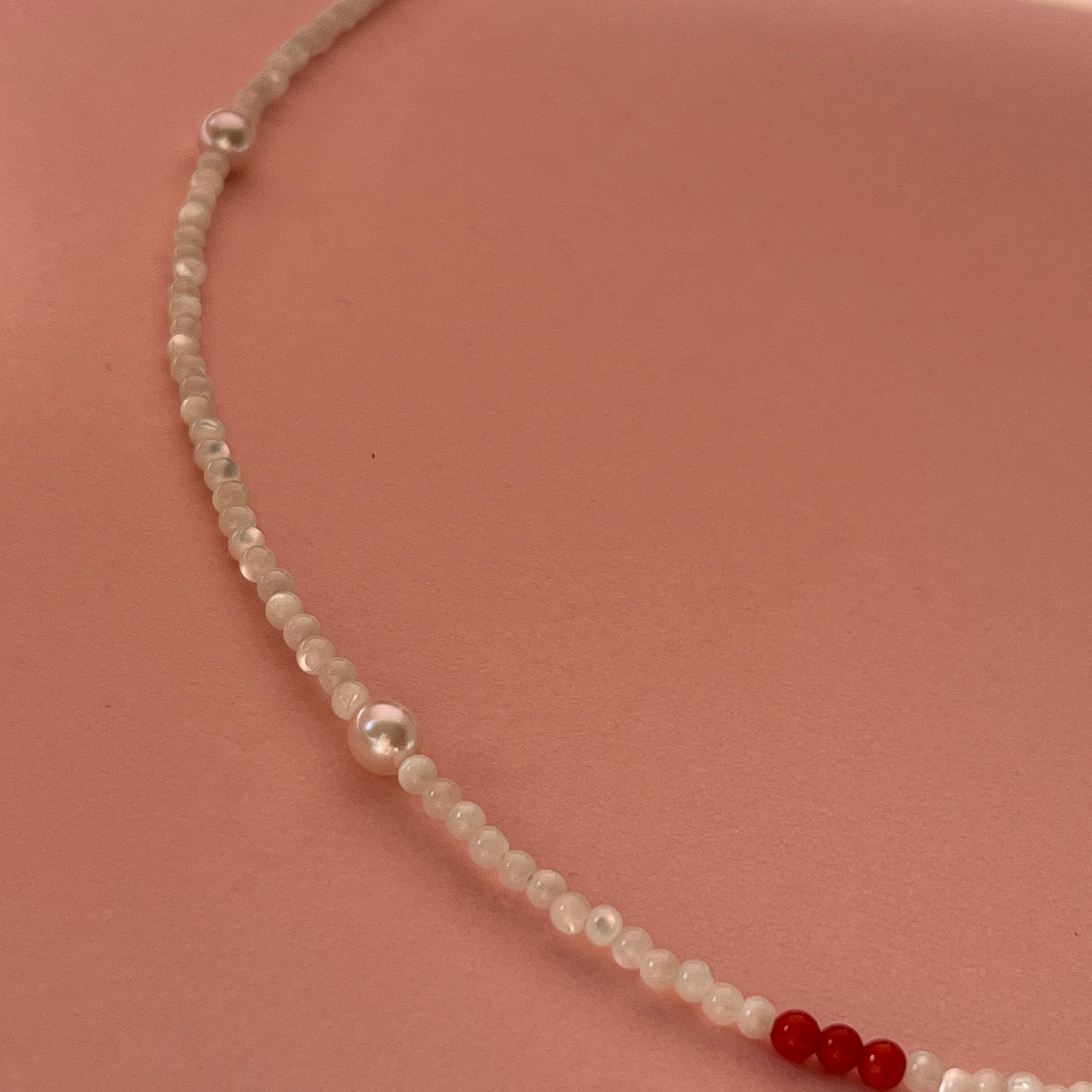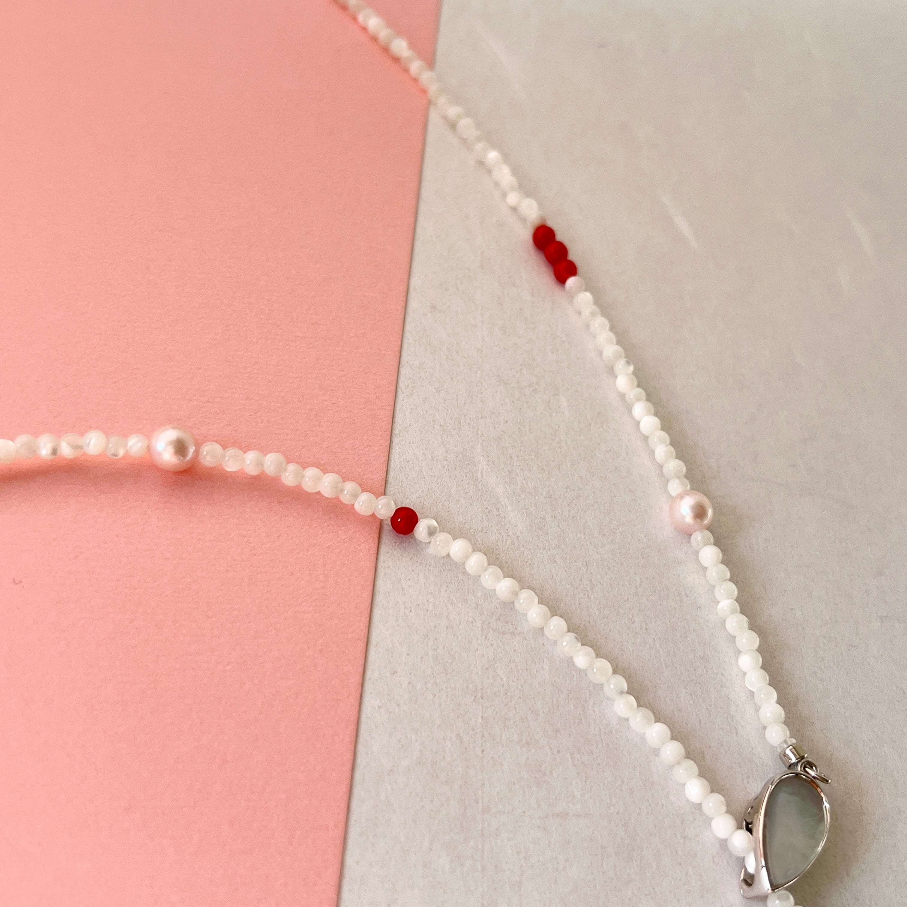 やさしい春色をまとった、上品で可憐なロングネックレス。あこや真珠のやわらかな艶めきに、白蝶貝のやさしい光沢、そしてアクセントとして散りばめられた珊瑚の赤が、シンプルながらも印象的な美しさを演出します。繊細なビーズとの組み合わせが軽やかで、長時間でも心地よく身に着けていただけます。